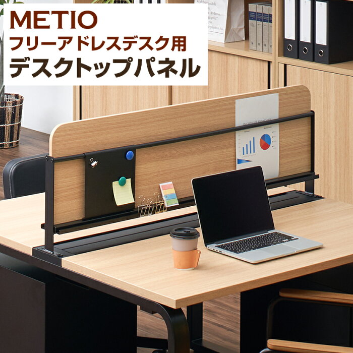 機能充実!対面を仕切って集中力と利便性がアップする「デスクトップパネル」 木の温もりとスチールの頑丈さを兼ね備えたハイブリッドシリーズ「METIO」専用の、フリーアドレスデスクと幅1200mmのデスクに取り付けられるデスクトップパネルです。