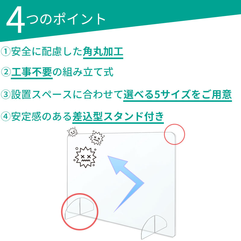 パーテーションとスタンドにはケガ防止の為、角丸加工を施してありご利用時も安心です。