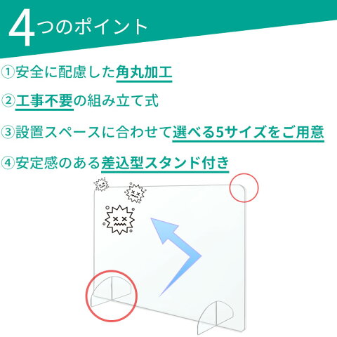 検索ワード】 アクリルパーテーション パーティション 仕切り 間仕切り 衝立 飛沫感染防止ボード アクリル 透明 クリア パネル 板 ボード 自立 スタンド 足 脚 付き 窓なし 開口部 無し 新型 コロナ ウィルス ウイルス 飛沫 感染 予防 拡大 防止 対策 まん延防止等重点措置 まん防 アクリル板 設置 サイズ展開 小型 小さい 角丸 卓上 縦長 横長 縦横 組み立て式 簡単 簡易型 飲食店 カフェ 居酒屋 お店 店舗 会社 オフィス カウンター テーブル デスク 机 会議室 受付 窓口 病院 薬局 クリニック サロン 学校 塾 教室 保育園 幼稚園 介護施設 補助金 助成金 幅 高さ 600 500 400 600mm 500mm 400mm 3mm商品説明 設置場所に合わせて選べる豊富なサイズバリエーション! 工事不要、置くだけなのでオフィスや病院、飲食店など様々な業種で簡単にすぐお使い頂けます。
